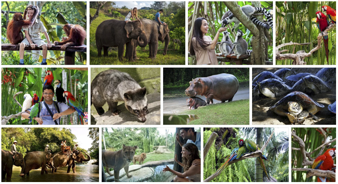 В парке вы сможете посмотреть на балийских скворцов и попугаев, австралийских какаду и африканских венценосных журавлей, полюбоваться на танзанийских фламинго, пообщаться с южноамериканскими попугаями ара, понаблюдать за пеликанами и забавными птицами-носорогами и увидеть редких казуаров и прекрасных райских птиц. Зоопарк- Общая площадь парка в 3,5 гектара стала домом для 350 животных 75 видов. Многие из них водятся только в Индонезии, такие как редкие и исчезающие суматранские слоны и тигры, орангутаны, солнечные медведи, бинтуронги.